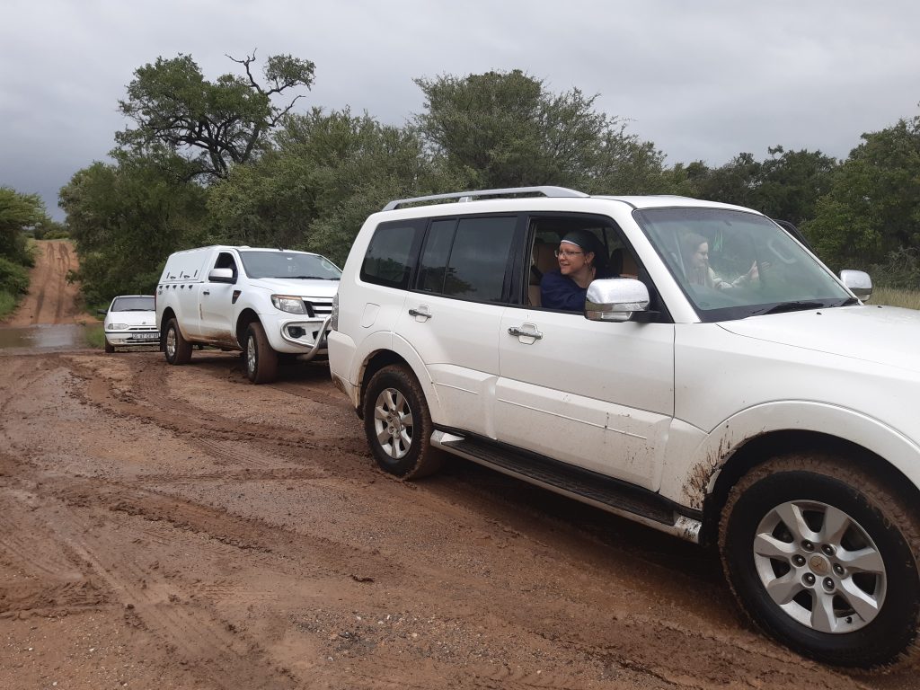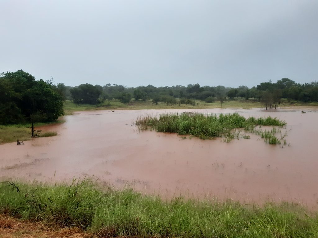 Vorige maand hebben we een heuse tropische cycloon over ons heen gekregen op de campus en in de nasleep hiervan, heeft het ruim twee weken bijna voortdurend geregend. Gelukkig zijn de temperaturen hier uiterst aangenaam, dus een beetje regen is nooit slecht. De wegen op de campus en het nabijgelegen reservaat zijn hier echter niet op berekend en dus was het zowel te voet als met de auto enkele weken ploeteren om vooruit te komen. Mijn hardloopschema raakte volledig uit beeld, aangezien de hoofdweg te voet onbegaanbaar was en het water in de dam op de campus steeg met de dag, tot uiteindelijk 15 cm onder de laagst gelegen rondavel. Gelukkig waren we goed voorbereid en hadden we alle waardevolle en kwetsbare spullen in de auto’s opgeslagen. De storm mistte ons uiteindelijk grotendeels en het rieten dak van onze rondavel bleek bestand tegen de vele regen. Inmiddels zijn de wegen weer grotendeels opgedroogd en gerepareerd en kan ik weer volop hardlopen. Voor de natuur is al dit water natuurlijk fantastisch en jarenlang droogstaande rivieren stromen nu weer volop.