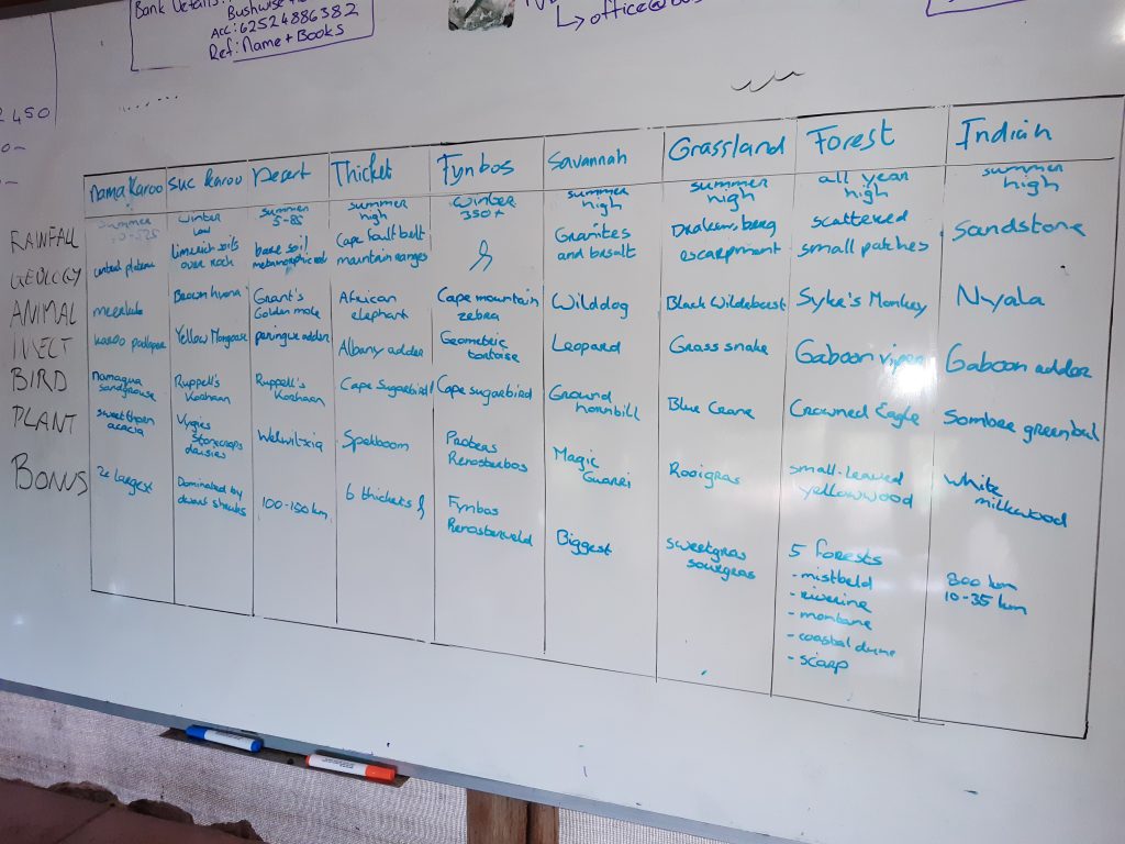 De komende twee à drie weken staan nog volledig in het teken van studeren en examens maken. Daarna komt voor mijn medestudenten het officiële FGASA examen, dat ik gelukkig al online gemaakt heb, wat mij wat meer ademruimte geeft om mijn praktische kennis van bomensoorten en vogelgeluiden te verbeteren. Na dit examen zullen we veel meer praktijklessen gaan krijgen. Zo staan naast de drives, ook sporen zoeken, een fourwheeldrive besturen over moeilijk terrein en schietlessen op het programma vanaf volgend semester. Maar eerst dus nog even bikkelen om de benodigde theorie te voltooien en mijn verkregen bijnaam als ‘doctor’ (volgens mijn trainer Darren schrijf ik bij iedere vraag tijdens de examens een volledige thesis over het betreffende onderwerp) eer aan te doen.