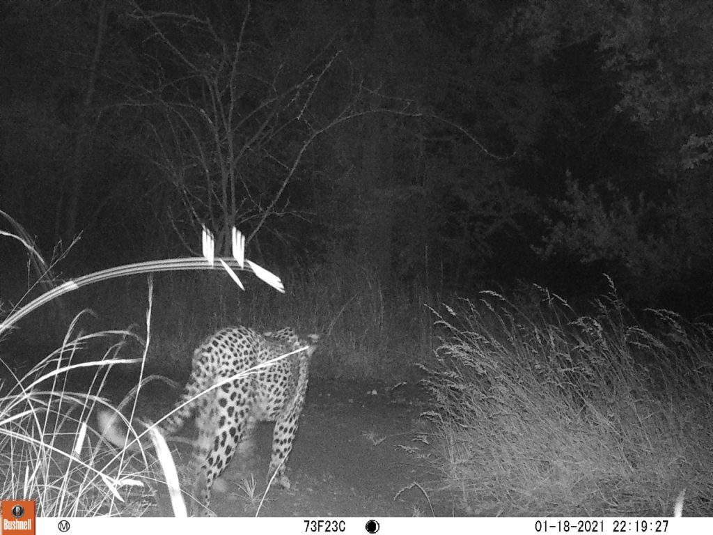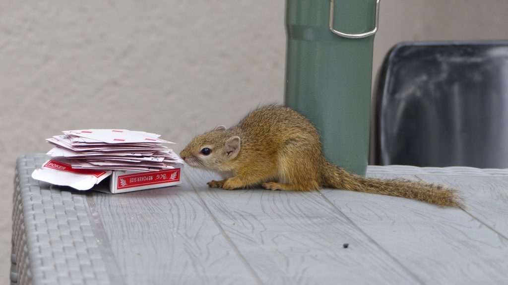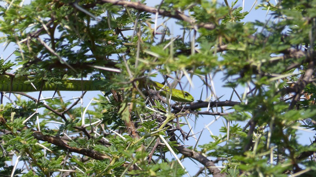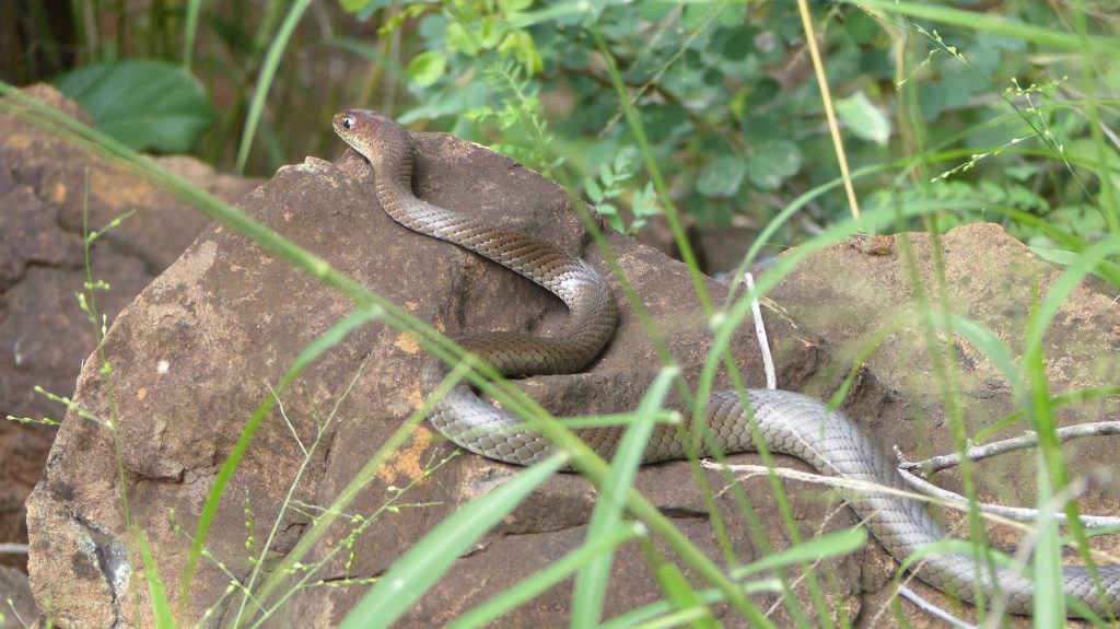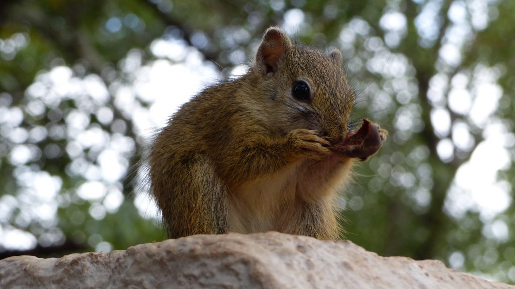 Ik begin me steeds meer thuis te voelen op de campus en hoe meer tijd ik buiten doorbreng, hoe meer bijzondere diersoorten ik hier tegenkom. Aangezien veel Zuid Afrikaanse medestudenten in de vrije week naar huis waren, werd de campus ook wat drukker bezocht door onze natuurlijke buren. Zo ben ik inmiddels, als ik ’s avonds alleen terug wandel van het klaslokaal naar mijn rondavel al meerdere malen een Afrikaanse civet tegengekomen. Zeer bijzonder, aangezien ik mijn volledige Master Thesis onderzoek naar deze soort heb uitgevoerd, zonder hem in levende lijve tegen te komen. Ook heb ik een avond bezoek gekregen van een stekelvarken en is onze koelkast meerdere malen geplunderd door een honingdas, met als gevolg dat we deze nu ’s avonds moeten barricaderen met gekantelde tafels. De cameraval vlak bij de keuken en toiletgebouwen heeft zelfs één nacht een luipaard opgevangen. Ook overdag krijgen we af en toe bezoek. Zo heb ik inmiddels al een boomslang, duizendpoot-eter en pufadder gezien en in de vrije week heeft een olive grass snake de hele dag naast mijn voordeur in de zon gelegen. De vervet apen verblijven graag vlak bij de keuken en recentelijk ook de tamme eekhoorn Timmie. Timmie is grootgebracht door een van onze trainers en vindt het leuk tijdens het eten van schoot naar schoot te springen en al rondrennend een hoop chaos te veroorzaken. Helaas bijt ze nogal graag, dus we mogen haar vooral niet teveel aandacht geven. Maar gezellig is het wel om een soort van huisdiertje te hebben.