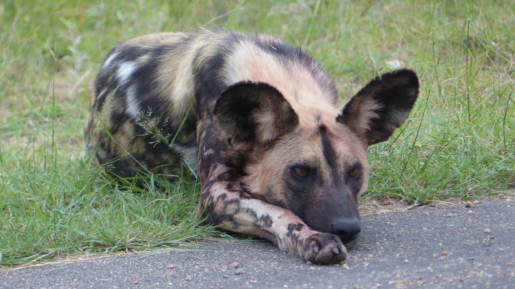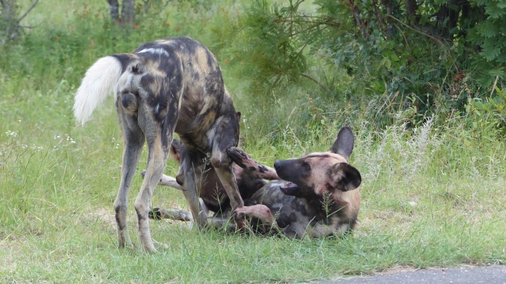 In de vrije week zijn we met een groep van negen personen drie daagjes naar Kruger geweest. Door de hevige regen vooraf en tijdens ons verblijf, werd dit een avontuurlijke onderneming. We hadden namelijk twee goed uitgeruste four-wheel-drives en een klein fiatje als vervoersmiddel. En ploegen door bijna een halve meter water, bleek voor die laatste een beetje hoog gegrepen. Gelukkig was de gecombineerde kracht van de drie auto’s voldoende om iedereen weer op het droge te krijgen. We werden rijkelijk beloond voor al onze inspanningen met schitterende waarnemingen van leeuwen, olifanten, hyena’s, bavianen en enkele zeldzame vogels als de Southern ground hornbill en de kori bustard. Het meest indrukwekkende was echter mijn eerste waarneming van Afrikaanse wilde honden. Twee dagen achter elkaar hadden we het geluk om een roedel van zes wilde honden te zien. Het mooie aan deze dieren is dat ze, in tegenstelling tot de meeste andere diersoorten, extra zorg dragen voor zieke of gewonde familieleden. Een van de wilde honden was gewond geraakt aan een achterpoot en in de tijd die wij doorbrachten bij de dieren, zijn vrijwel alle andere leden van de roedel even komen snuffelen en kijken of het goed ging met hun gewonde familielid. Toen we ze de volgende dag wandelend langs de weg tegen kwamen, liep het gewonde dier ook niet in zijn eentje achteraan, maar werd hij steeds vergezeld door elkaar afwisselende soortgenoten. Deze hechte band tussen familieleden is zeldzaam in het dierenrijk, maar daardoor extra bijzonder om van dichtbij te zien.