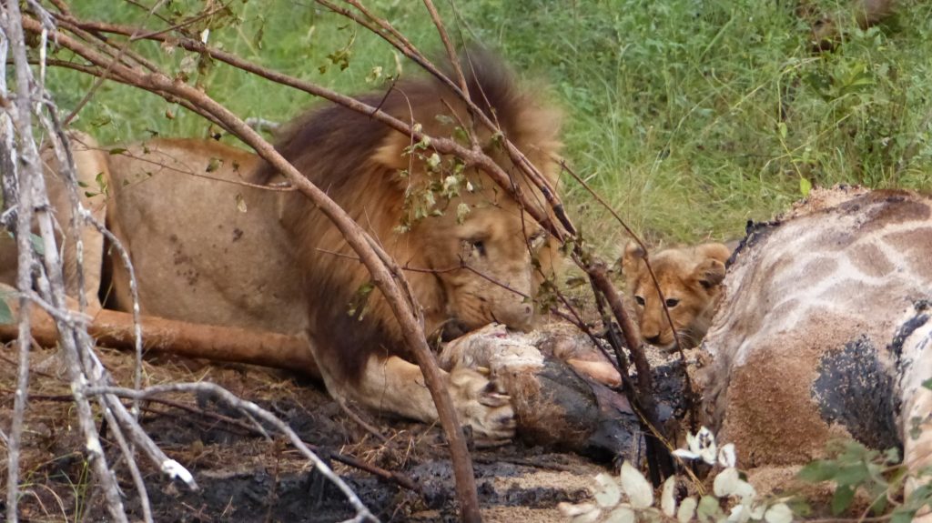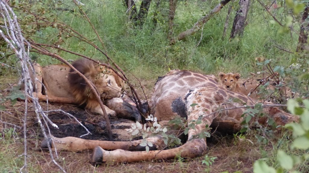 … En dan is het blog eigenlijk al af, heb je ineens de beste denkbare sighting. We hadden al gehoord dat er een karkas van een giraffe gevonden was de vorige dag, dus vanmiddag toen de game drive begon, reden we meteen die kant op, om te kijken of de leeuwen, die de giraffe geveld hadden, nog aanwezig waren. Helaas was er geen activiteit behalve enkele gieren en een jakhals. Na een rondje door het reservaat gemaakt te hebben en een koffiepauze, gingen we vlak voor zonsondergang terug naar het karkas en opnieuw was er geen activiteit. Net toen we weg reden, kwam er echter een grote mannetjesleeuw onze kant op gelopen. Snel reden we terug en zochten een mooi plekje uit op ongeveer tien meter afstand. Vervolgens kwam niet alleen de mannetjesleeuw zijn avondmaaltijd nuttigen. Twee piepkleine welpjes hadden het lef om het vlees precies onder de neus van hun vader uit te halen. Gelukkig zijn leeuwen echte familiedieren en vond vaders het niet erg zijn maaltijd met zijn kroost te delen. Van een afstand keken twee vrouwtjesleeuwen aandachtig toe. Zelf toen het mannetje op een gegeven moment het karkas verliet en de twee welpjes alleen achter bleven vlak bij onze auto, leken de vrouwtjes het met een gerust hart te aanschouwen. Helaas werd het al snel te donker en moesten we terugkeren naar de campus, maar mijn eerste waarneming van leeuwenwelpjes is 100% onvergetelijk!